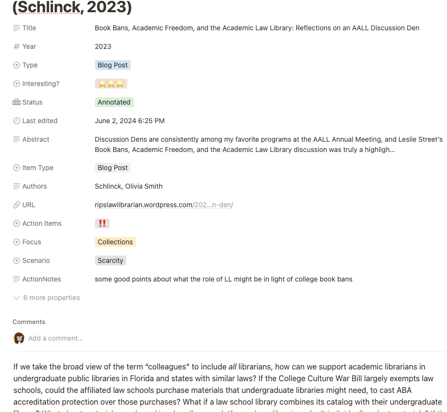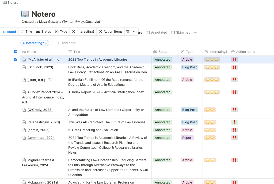 With Notero, I saved my work to Zotero and evaluated my sources in Notion. I could mark what I had read, what I had planned to read later, and what I had skipped. I could easily see which resources were most valuable to my work. I could copy quotes to refer to later as well as create action items for next steps.